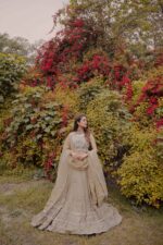 Description: A soft pistachio embroidered lehnga choli adorned with crystals and pearls, exuding elegance and charm. The ensemble is paired with a pleated organza dupatta, featuring a gentle color palette accentuated by exquisite artisanal craftsmanship — a perfect blend of grace and tradition.