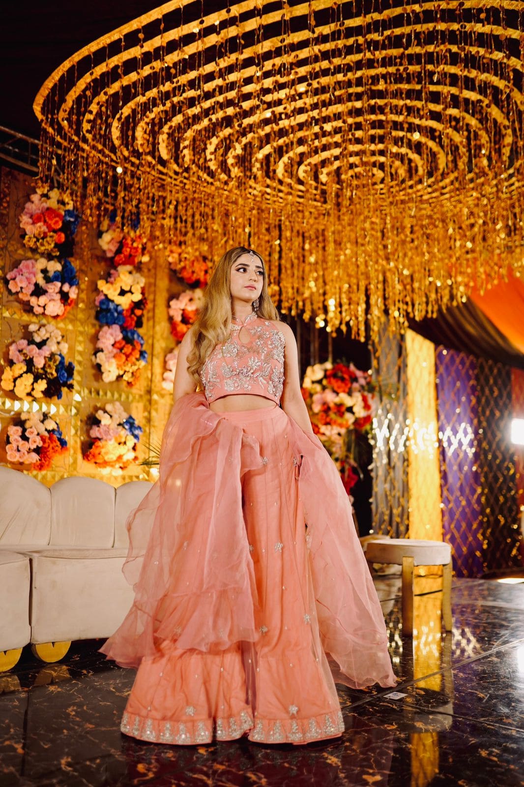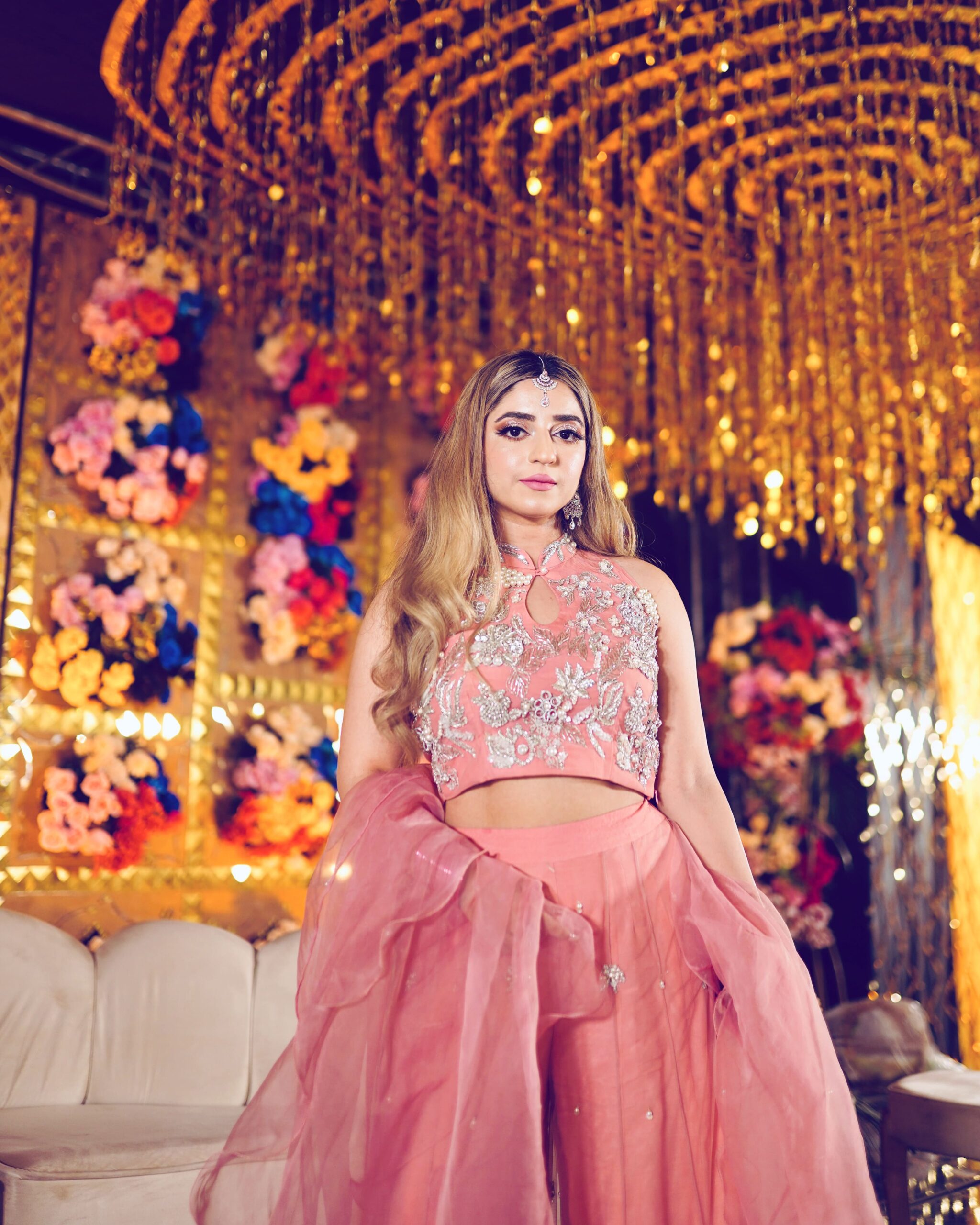 Description: Monique — a soft pink vision of elegance. This customized ensemble features an organza choli paired with a flowing sharara, creating a look that radiates feminine charm and grace. Perfectly balanced between delicacy and sophistication, it’s an ode to timeless style.