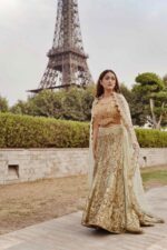 Description: A delightful silhouette featuring a radiant gold choli paired with a mint lehnga, adorned with exquisite hand embellishments artistically worked across the fabric. The ensemble is completed with a beautifully flared mint organza dupatta, showcasing intricate embroidered cutwork details that create a truly remarkable statement.